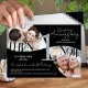 En modern, stilren och unik bröllopsdagskort designad för 1-årsdagen, med eleganta svarta och silvertoner och iögonfallande svart silver diamanttext och diamantstilad numrering. Denna moderna minimalistiska layout visar en flödande böjd "Då" och "Nu" fotokomposition som framhäver en vacker resa från bröllopsdagen till nutid. Den djupa svarta bakgrunden i kombination med glänsande silver diamantdetaljer skapar en stilren och förfinad kontrast, medan ren modern typografi håller designen unik och fri från onödig grafik. Fullt anpassningsbar med foton, namn, datum och evenemangsinformation, är detta moderna och stilrena kort perfekt för att fira en unik första bröllopsdag i ett svart och silver diamanttema.