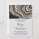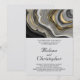 En modern stilig bröllopsinbjudan. Med en abstrakt design med en bild som ser ut som en agat geod. Guld, grått, vitt och svart virvlar samman och bildar eleganta färgvågor. Perfekt för att förmedla en känsla av klass och elegans.