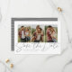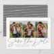 Med tre vertikala foton och en modern text skriven "spara datumet" är detta kort det perfekta sättet att tillkännage din förlovning och kommande bröllop till vänner och familj. Den chic grå texten är djärv och modern men fortfarande sofistikerad. Den anpassningsbara texten på framsidan har plats för namn, datum, plats och annan information som en bröllopswebbplats. Baksidan är ett neutralt grått och vitt randigt mönster. Färgen kan redigeras genom att klicka på "Anpassa".
