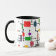 Mugg har ett modernt mönster i mitten av århundradet som består av ett stort rutnät av vågrät och lodrät svart linjer med färgstarka rektanglar.