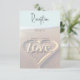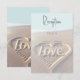 Denna bröllopsinbjudan design har ett unikt hjärta med ordet kärlek etsat i sanden på en strand med mjuk tidvatten och blå himmel i bakgrunden. Framsidan har en vellum-look. Så unikt! Det är en del av Modern Strand med Hjärtat Bröllopsserie skapad av Simply Farmhouse Press.