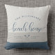 Modern, chic borstskrift läsning STRANDHUS vid sidan av ditt familjenamn i en trendig typografi-driven design. Stor anpassad heminredning kudde för ditt hem borta från hemmet. Både romantiska och stilrena, våra dämpade toner av sand och dammig blå kudde har en söt kanot illustration mellan din plats och det år etablerat.