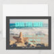 Modern, icke-traditionell Save the Date-inbjudan med strandscen (med vågor och sjöstjärna i sanden) fotograferad bakgrund med Save the Date i akvamarin neon. Mörkgrå ram, Anpassa med bröllopspar detaljer.
