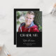 Det här moderna fotokortet i studenten har enkel typografi och ett stort foto. Ett foto av vågrät student ligger överst, där "Student" i ord är skrivet i trendigets versaler nedan. Under typografin lägger du till student namn i manusyrgrafi, med skolan och studenten i grund på kortet. Typografin är vit mot svart bakgrund. På baksidan av kortet i studenten finns en valfri mall för att lägga till studentfest.