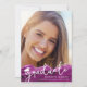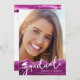 Skapa ett förbluffande fotomeddelande i studenten med trendig magenta och rosa färg och faux rosa glitter för din dotter med handskriven manustypografi för titeln chic accentuerad med en STUDENT eller pantpapp i vitt på framsidan. Baksidan innehåller ett foto och anpassningsbarna som innehåller information om student. Gör en unik design som återspeglar hennes stil och koordinerar med hennes bilder till med dina vänner och familj. ASSISTANS: Om du vill ha hjälp med designändringar eller anpassning, ändra storlek på eller överföra designen till en annan Chatta kontaktar du designern FÖRE ORDERING via fliken Zazzle MESSAGE nedan eller e-post makeitaboutyoustore@gmail.com.
