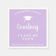 Moderna studenten-blöjor med "Grattisar" och en graderingshatt ovanför student namn i ett elegant tjockt manusformat tillsammans med klassåret och namn i skolan i vitt över en lila. Bakgrunden kan ändras till valfri färg. Dessa servetter är ett underbart sätt att göra studentfesten personligt rörd.