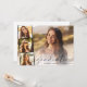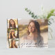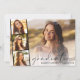 Ett platt kort med platt studentfest med elegant-skript överlägg som innehåller ett platt kort med student överlagrade med tre mindre fyrkantiga foton och "student" i ett tunt, modernt skript och deras namn och klassår i enkel typografi. På motsatt sida lägger du till information om studentfesten.