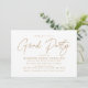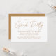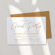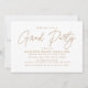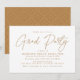 inbjudningskort för roligt och modern studentfest som innehåller "Grad Party" i ett skript av trendig guld med information om studentfesten som visas nedan. Den enkla studentfesten inbjudan går tillbaka till visningen ett sött guld och vitt prickat geometriskt mönster.
