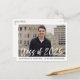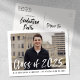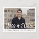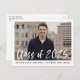 Snyggt, vykort för den moderna studentfestens inbjudan med student-fotot i vitt med "Klass 2025" i ett vitt, vattenfärgat penselöverlägg. Anpassa fronten genom att lägga till student namn och namn i svart text. Inbjudan återgår till visning av returadress och studentfest i svart text.