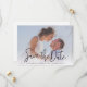 Den här enkla, snyggt moderna bröllop spara datum-platta bildkortsmallen innehåller "Spara datum" i ett mycket modernt skript med det första namn, datum och bröllop på en enda rad nedanför den. Skriptet Spara datum är svart och standardtexten färg för namn, datum och plats nedan är ett mycket mörk grått som oftast är svart. Du kan ändra färg eller typsnittet för detaljtexten till kostym till din smak. Vi har gjort standardformens vassa hörn av standardtyp, men rundade hörn fungerar också på ett underbart sätt med den här designen, så försök att både titta i redigeringsläge och se vilka taggar du har! På baksidan valde vi en atypisk ordning för informationen och satte texten "Spara datumet" efter texten "för bröllop av", som ger väg mindre resande charm till den. Du kan enkelt ändra den här ordningen eller ändra något annat till kostym efter dina behov. På baksidan har vi gjort bakgrunden genomskinlig för att helt enkelt låta färg i det pappra vara som baston. Du kan enkelt ändra detta genom att antingen välja ett av de grundläggande färgerna i det redigerande verktygen eller genom att ange ett färg-nummer om du har en specifik nyans i åtanke som du hittade i din forskning, eller genom att tittar vid färg spektrum verktyg och välja något vid synhåll. Standardtexttonen på baksidan är grått, men du kan redigera den till förmån för en annan text färg, och du kan också ändra något av teckensnitten. Använda den intuitiva redigeringen och designen av verktyg, ditt favoritfoto och din inspiration för att göra det här enkla chicen bröllop spara datum-fotokortet unikt för dig!