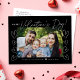 Dagkortet "Glad Alla hjärtans dag" i ett vitt skript i trendiget med handdragna hjärtan längs kortets sidor på en svart bakgrund. Vågräts foto visas nära mitten i designen. Anpassa Valentindagens vykort genom att lägga till ditt namn och året i vitt. vykortet återgår till visning av din returadress och ditt personliga meddelande.