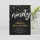 Moderna inbjudningar till 90-årsfest med en stilren svart bakgrund, vit & guldkonfetti, titeln 'nittio' i en fet skrivstil och en enkel textmall som är lätt att anpassa.