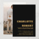 Bjud in dina vänner och nära och kära med denna stilrena minimalistiska svarta med guldtext bröllopsinbjudan med ett foto av det nygifta paret på baksidan för att dela din glädje i ditt senaste äktenskap. För bästa resultat anpassa din valda bild för baksidan av inbjudan genom att beskära den till ett 5 x 7-förhållande.