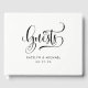 Modern gäst bok i bröllop för "gäster" har ett modernt svartvitt färg-schema med vackra handskrivna kalligrafskripttypografi. Anpassa avslappnadens monogramtext för anpassningsbar av elegant till bröllopsdagen.