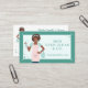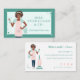 Modernt och professionellt visitkort för städservice med en vacker leende och vänlig afroamerikansk kvinna med en hand på höften och en hink med såpigt vatten och bubblor, och med den andra handen håller hon i en flaska rengöringsmedel. Damen bär en söt rosa randig förkläde med en mintgrön skjorta och jeans. Tvåtons grön ramdesign med hjärtram och gnistrande detaljer. Anpassa med ditt företagsnamn, webbplats och monogram som placeras på förklädets ficka. Baksidan visar den vackra afroamerikanska damen med en dammsugare bredvid sig. Anpassa med ditt namn, jobbtitel, kontaktinformation och socialt handtag. Alla illustrationer är handritade originalkonstverk av Moodthology Papery.