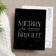 Modern vykort för helgdag med "Merry and Bright", som visas med vit text och en svart bakgrund med subtila vita punkter (snö). Anpassa framsidan av vykortet för icke-fotofoto-helgdag med din familj namn och året med vita bokstäver. vykortet återgår till visning av returadressen och personligt meddelande i svart skrift.