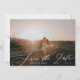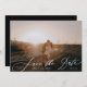Fin kalligrafi med vita bokstäver som täcker över fotot sparar datumkortet. Modern svart och vitt, enkelt foto Bröllop spara datum.