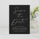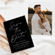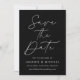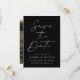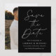 Meddela ditt kommande bröllop i stil med det här trendiget Spara datumkortet med Modern Black Script-fotot! Designfunktionerna "Spara datum" som visas i trendigets vita kalligrafi med svart bakgrund. Anpassa minimalisterna spara datumet med namn, bröllop-datum, plats och bröllop webbplats. Datumet återställs till visning av förlovningen för fullt-utfall i lodrät. Chicen svart och vitt sparar datumet för valet av perfekt för det moderna bröllop.