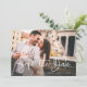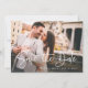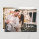 De här moderna, enkla och elegant bröllop sparar datumkorten med handskript på framsidan som ett överlägg på snyggten. Baksidan har en enkel vit bakgrund med klassisk svart text och ett annat foto, tillsammans med en skannerbar QR-kod för att lägga till webbplatsen bröllop.
