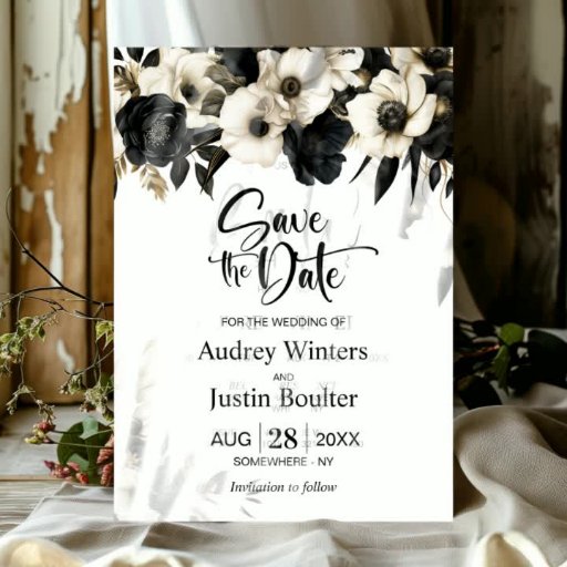 Modern Svarta och vita Blommigten Bröllop Inbjudningar