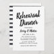 Dessa minimala och snyggt bröllop-repetitionsmiddagsinbjudningar har en svart, borstad, handskriven skripttitel och en mönster av svart och vitt vågrät rand på kortets baksida. Den moderna anpassningsbarna kan vara fullt personlig för din speciella händelse.