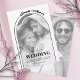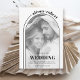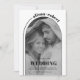 Modern svartvit båge och fotoöverlägg minimalistisk bröllopsinbjudan. Fokuspunkten är en snyggt som elegant ramar ett foto av paret och som tillför en liten nostalgi till inbjudan. Detaljerna i bröllop sätts på ett klokt sätt in på bågen, så att de smidigt blandas med helestesiet. Om du vill lägga till en unik beröring skrivs parets namn i ett böjt teckensnitt överst, efter den roliga kurvan för en linje som sträcker sig till högerna, skapar en visuellt tilltalande sammansättning. Om du bläddrar till inbjudningens baksida visas ett annat foto, vilket ger en personlig och intim beröring till den övergripande designen.