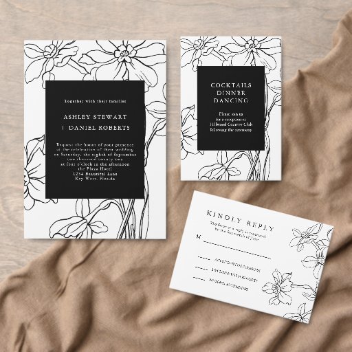 Elegant, modern bröllop-svit med en tidlös blommigt teckning. Enkel och klassisk, svart och vit design.