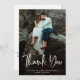 Det här moderna och elegant bröllop-tacket som du använder på kortet innehåller ditt bröllop-foto på framsidan, med ett skript som täcker det vita trendiget och plats för ett annat foto och ett annat meddelande på baksidan. En snyggt och ett enkelt sätt att tacka!