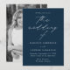 Minimalistisk, modern bröllopsinbjudan som innehåller dina bröllop-detaljer i ett enkelt vitt brev med "bröllop av" i ett kalligrafiskt skript för elegant med marin bakgrund. Inbjudan går tillbaka till visningen av förlovningen lodrät. Designad att samordna med vår moderna elegance bröllop-samling.