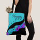 This hand drawn shoulder bag has a bold turquoise top with the word Happy in a fun cursive font (customizable to your name or favorite word). Below, a curved black stripe spells out STUFF in block letters, leading into a vibrant abstract pattern of blue and purple shapes with playful black dots. The bottom is solid black for contrast. It’s roomy, stylish, and perfect for carrying everyday essentials with a cheerful vibe.