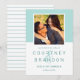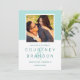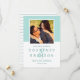 Modern bröllop spara datum-annonskort har ett fyrkantigt foto med förlovning i akva/mintblå grönt med ett enkelt och minimalistiskt stil-monogram av bruden och groom namn med ett skript för elegant. Anpassa datumtexten med datum och plats i bröllop. På baksidan av kortet finns en slimmad mönster av tunn grönt och vitt vågrät rand.