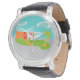Den moderna Tecknaden House Manar Watch vill att du ska lägga ut WELCOME-mattan och göra dig hemma! 1960-talets minimalistiska konstdesign har en sliek, orange sten och ett akvasglastak på en lush, grönt, bomerangformad gräsmatta. Gräsmatta utgör en oas i mitten på grått, betongomgivningar. En grönt handflatan träd sviktar i brisen. Fyra, styrstenar med orange leder vägen till reflexen, röd, främre dörr med tre, rektangulära glasrutor. Till lämnad om dörren har en turkosflowerpot en tropisk grönt. Huset har en sluttande, V-formad vit tak som pekar mot två, vita, njurbönformade moln. Himlar är en positiv serenskugga av aqua. Ingen kommer att vilja kasta sten från denna moderna, glashusdesign! Köp den här kitschin, produkten för rumsåldern och var den kallaste katten på ditt block!