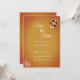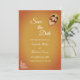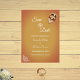 Elegant guldbrun med terracotta shades romantiskt Spara datumkortet Bröllop. Krysanthemumblomman på framsidan och två hjärtan på baksidan kan anpassas. Idealisk för par som tror på det eviga kärlek och en match i himlen. Krysanthemumblomman står för royalty.