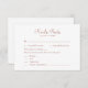 Behåll din bröllopsbrevpapper elegant och funktionell med detta moderna terrakotta- och vita minimalistiska RSVP-kort. Med ett stilrent "Kindly Reply"-manus och ren layout kombinerar denna design tidlös sofistikation med varma jordnära toner. Gästerna kan enkelt fylla i sina måltidsval och notera eventuella kostrestriktioner, vilket gör planeringen enkel. Baksidan innehåller parets returadress för en polerad och färdig att skicka finish. Perfekt för moderna, boho- eller rustika bröllop som älskar enkelhet med en touch av värme.