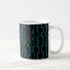 Mugg har en modern utformning av linjer i mitten av århundradet med halvrektanglar i turkos på fält i svart.