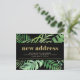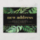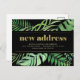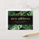 Trendigets tropiska förändring av adress-vykort har en ram av modern monstertid och andra grönt tropiska löv med faux guld linjer på en mörk, svart bakgrund. Ord "ny adress" visas i trendig, contemporary faux guld typography. Ett enkelt men snyggt flytta-meddelande som du kommer att vara stolt över att skicka till vänner och familj.