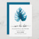 Modern bröllop spara datum-kortdesign med vattenfärgad monstera löv-illustration på en vit bakgrund. Inbjudan är omvänd i djupt blå färg.