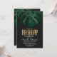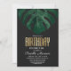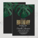Elegant, modern och enkel grön akvarell tropisk strand schweizisk ost monstera blad på svart bakgrund med falsk tryckt guld folie typografi sommar Födelsedagsfest Inbjudningar. Denna klassiska och sofistikerade design är perfekt för den klassiska, stiliga och trendiga födelsedags personen. Anpassa med eget meddelande på framsidan och anpassad monogram på baksidan. Alla foto tryck design
