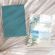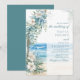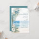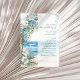 Sätt tonen för en chic och stilfull strandfest med vår moderna tropiska strand- och blomsterbåge bröllopsinbjudan. Denna fräscha, samtida design har en fantastisk akvarellskildring av ett tropiskt havsutsikt, inramad av en frodig blomsterbåge. Med endast halva bågen synlig i bakgrunden skapar den asymmetriska kompositionen en djärv, modern estetik. Ömtåliga blå och vita blommor med mjuka gröna blad förstärker den bohemiska elegansen i denna inbjudan, medan texten är vackert arrangerad på höger sida för en snygg, ungdomlig look.