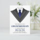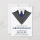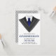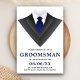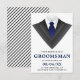 Bjud in dina bröllesgäster med detta moderna förfrågningskort med en klassisk smoking med en blå slips mot en vit bakgrund. Lägg helt enkelt till dina evenemangsuppgifter i denna lättanvända mall för att göra det till en unik inbjudan. Vänd på kortet för att avslöja ett svart och vitt randigt mönster på baksidan av kortet.
