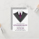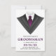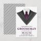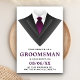 Bjud in dina bröllesmän med detta moderna förfrågningskort med en klassisk smoking med en lila slips mot en vit bakgrund. Lägg helt enkelt till dina evenemangsuppgifter i denna lättanvända mall för att göra den till en unik inbjudan. Vänd på kortet för att avslöja ett svart-vit-randigt mönster på baksidan av kortet.