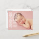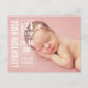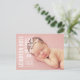 Foto födelseannons kort för babyflicka har en modern stilmässig textöverläggning med barnets namn och födelsedetaljer. Utrymme för ett extra foto ingår på baksidan av kortet. Vit textfärg kan anpassas för att kontrastera din bild.