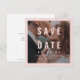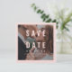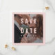 Modern typografi sparar datumdesignen i rosa, med ett pars foto, enkla och elegant. Underbart litet kvadratiskt foto sparar datumkort för moderna bröllop och andra evenemang.