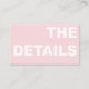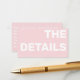 Det här moderna inklippningskortet har stora, feta och roliga bokstäver för ”DETAILER” i ljust rosa med lättläst vit typografi, vilket ger en livfull och minimalistisk look. Perfekt för bröllop eller fester, det erbjuder utrymme för att lägga till viktig information om lokal, RSVP och mottagning i en enkel stil som gästerna kommer att tycka är tydlig och lättillgänglig. Anpassa meddelandet för att passa vilken fest som helst, vilket gör detta kort till ett stilrent och praktiskt tillägg till din evenemangspapper.