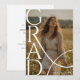 Med denna moderna fotoförfrågan till examen firar du examen på ett extra speciellt sätt. Designen har en djärv, vertikal ”GRAD”-typografi som överlagras och skapar en stilren och modern utstrålning. De stora, eleganta bokstäverna inramar examenkandidatens foto på ett vackert sätt och gör bilden till designens huvudsakliga fokus. Ett mjukt, flödande linjeelement lägger till en subtil, konstnärlig detalj samtidigt som stilen hålls ren och minimalistisk.