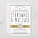 Modern svartvit typografi av bröllop pars duschinbjudan accentuerad med guld. Den visar texten i svart på vitt och datum för din möhippa på en guld-banderoll. Det finns en svart gräns runt den. Baksidan omfattar ett mönster med vitt kor på guld färg.