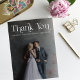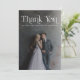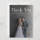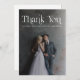 Ett modernt elegant bröllop-tack till dig, med ditt favoritgrafikkort bröllop porträtt överlagt med "Tack" överst i modernt serif-teckensnitt i vitt. Logga ut med namnen.