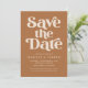 Spara datumkortet med "Spara datumet" som visas med fetstil och beige text med en terracotta-bakgrund. Anpassa snyggten spara datumkortet med namn, bröllop-datum, plats, bröllop webbplats och annan viktig information om bröllop.