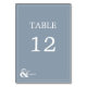Ett modernt och unikt bröllop-bordsnummer som omfattar namn i bruden och brudgummen i dammblått. Anpassa din egen Dusty Blue bröllop med den här designen och färg i vår samling.