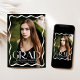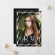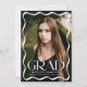Fira högskolan eller högskolan student med snyggtens uttalande studenten, som innehåller ett fullt-blekt lodrät med en modern vit vågigt gräns, "Grad" visade fet stil och personlig, inklusive student's namn, skola och klassår. Baksidan visar ett foto med vågrät med utrymme för ett anpassningsbar-meddelande, skapar det perfekten till att denna speciella milstolpe med familj och vänner.